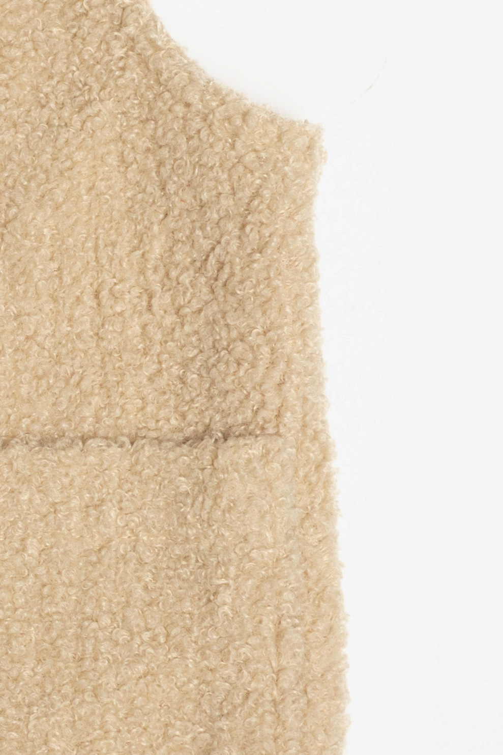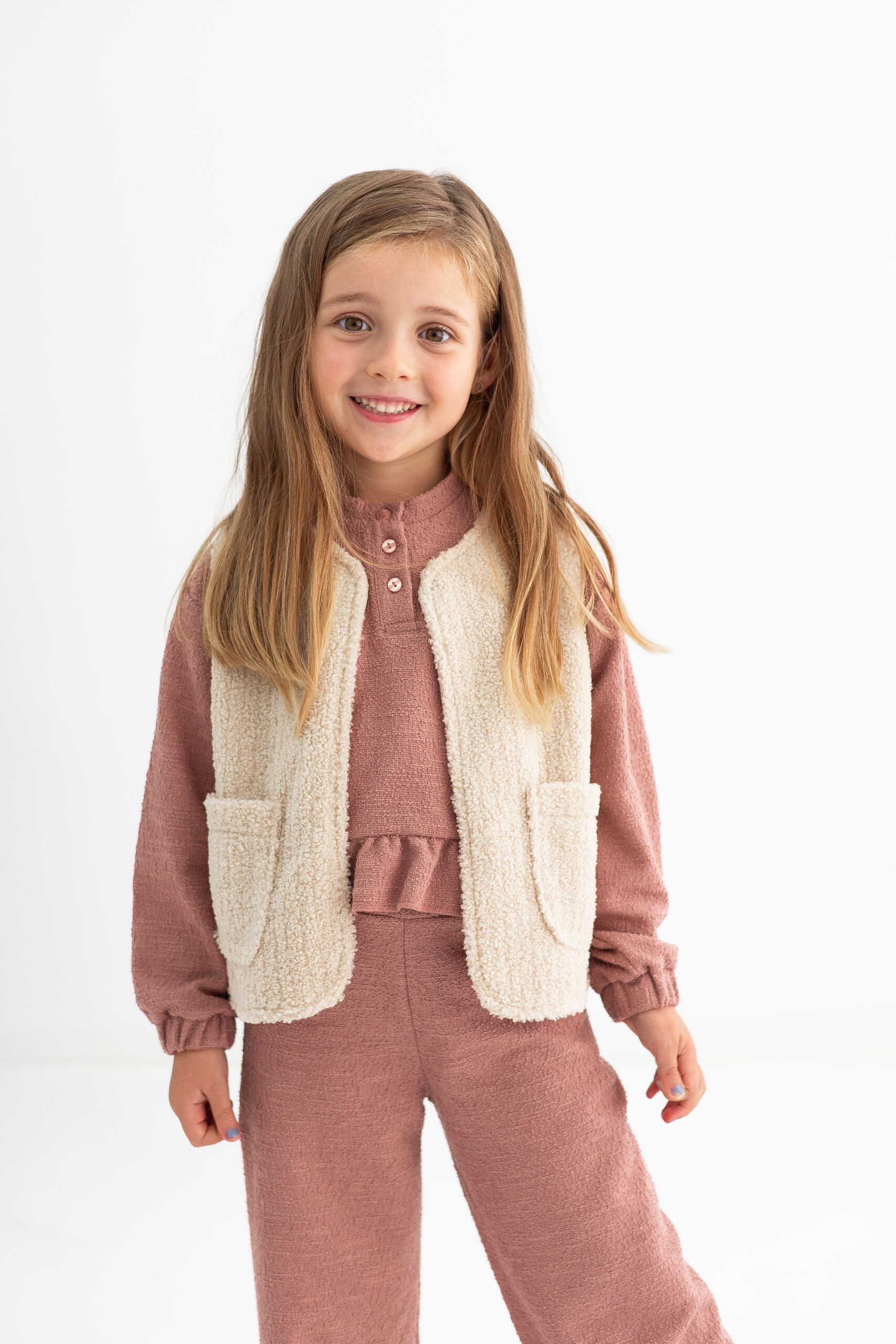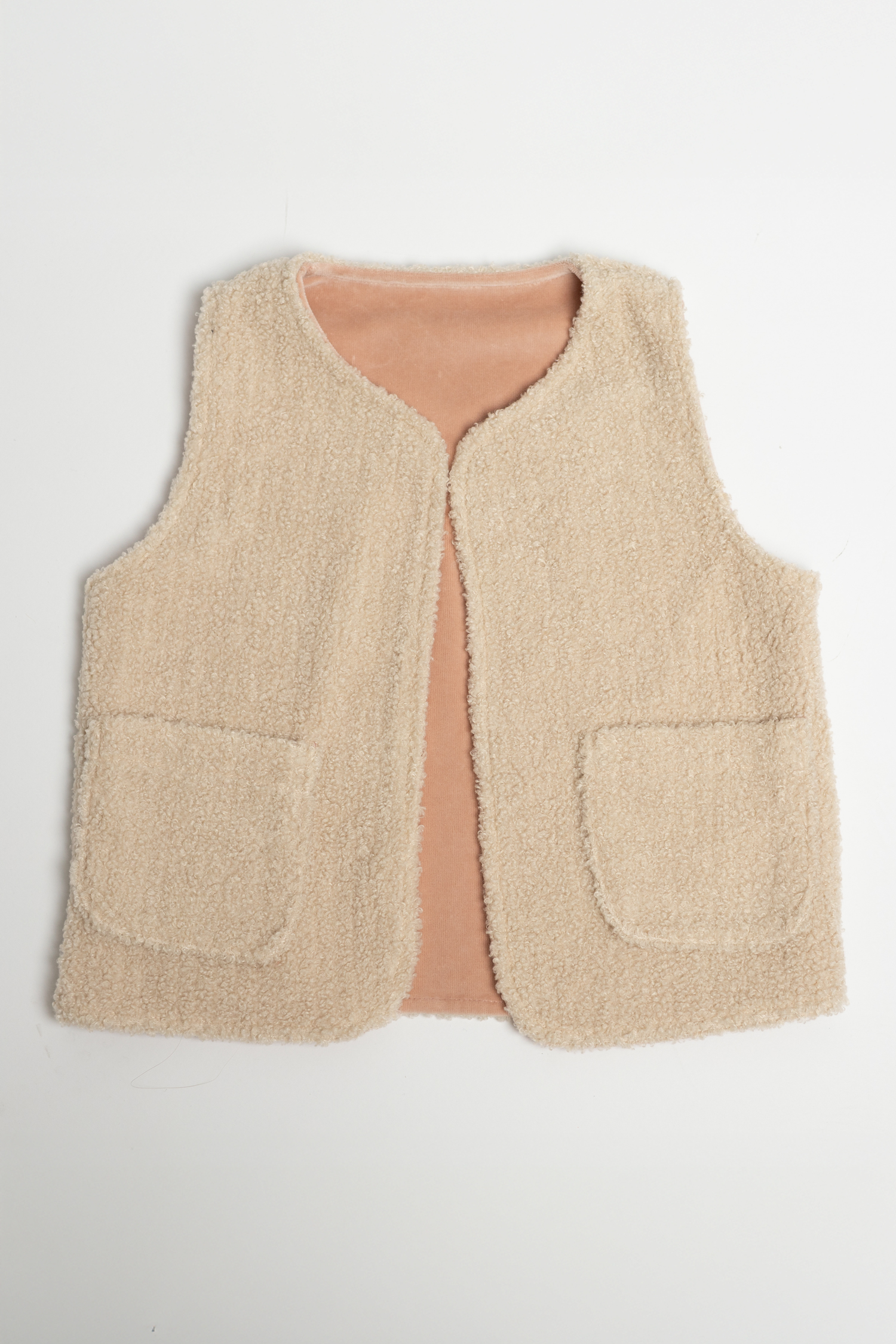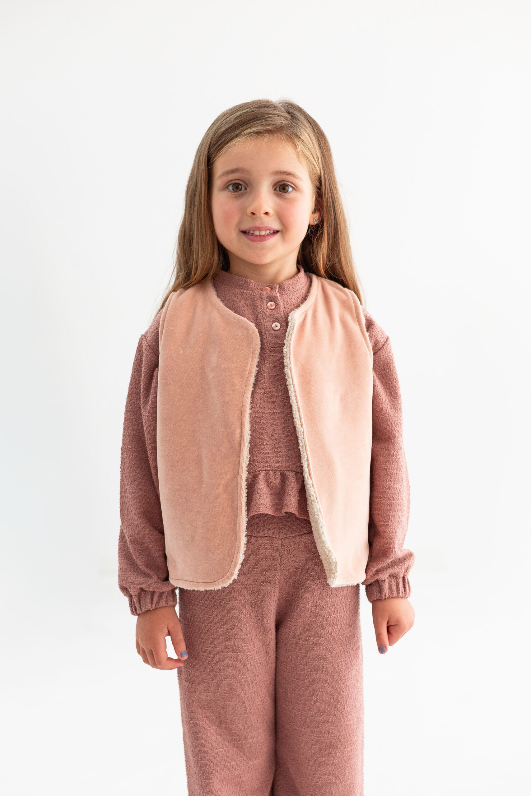 Colete dupla face outono/inverno de menina, pêlo cor bege e veludo rosa, produzido em Portugal, em algodão.