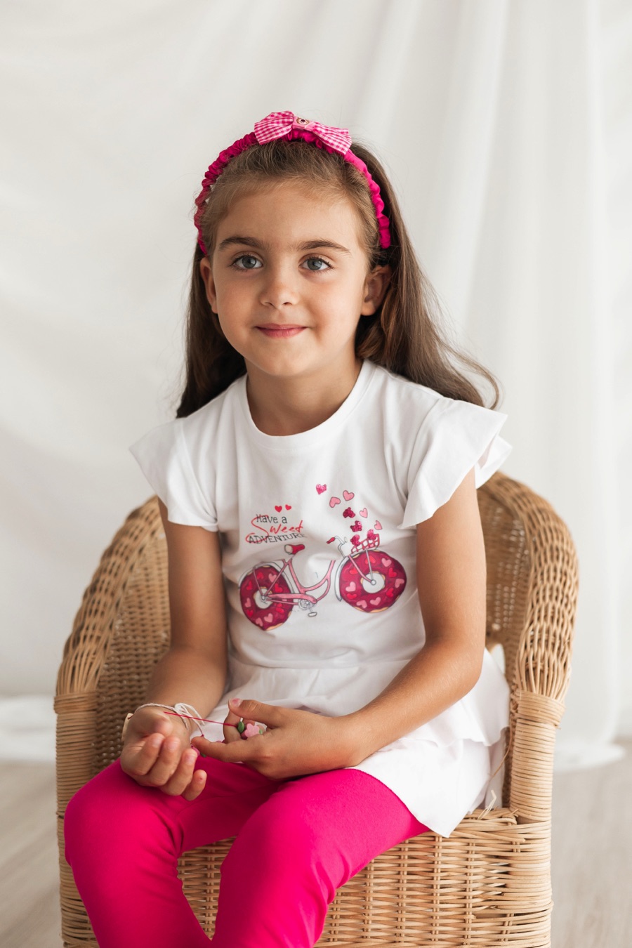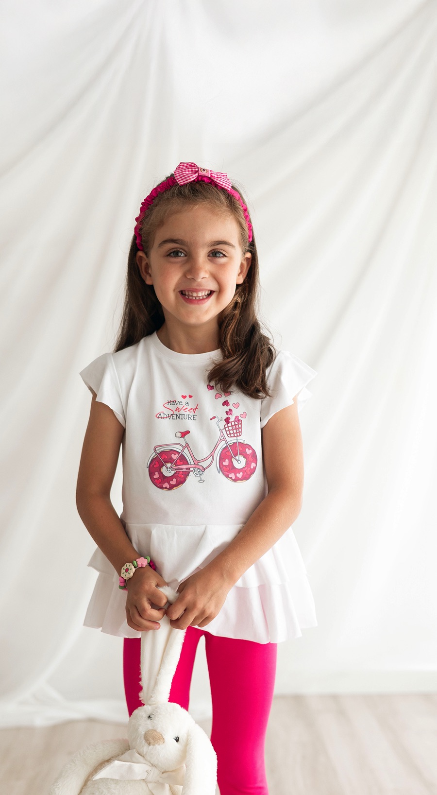 Vista a sua aventureira e deixe que a bicicleta a leve para onde a diversão estiver!! Apresentamos o Conjunto biker, confecionado com 95% algodão e 5% de elastano que garante liberdade para brincar.