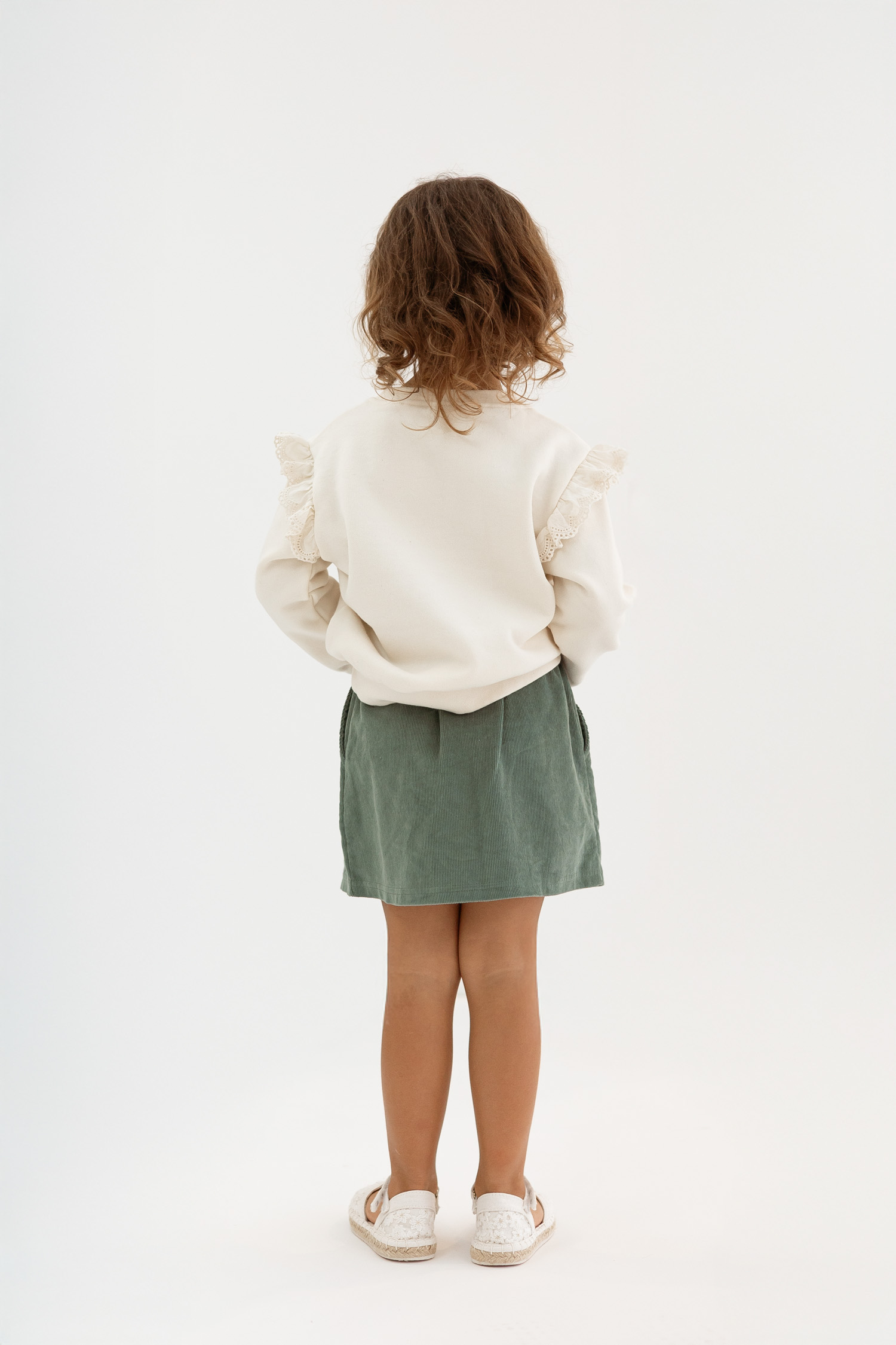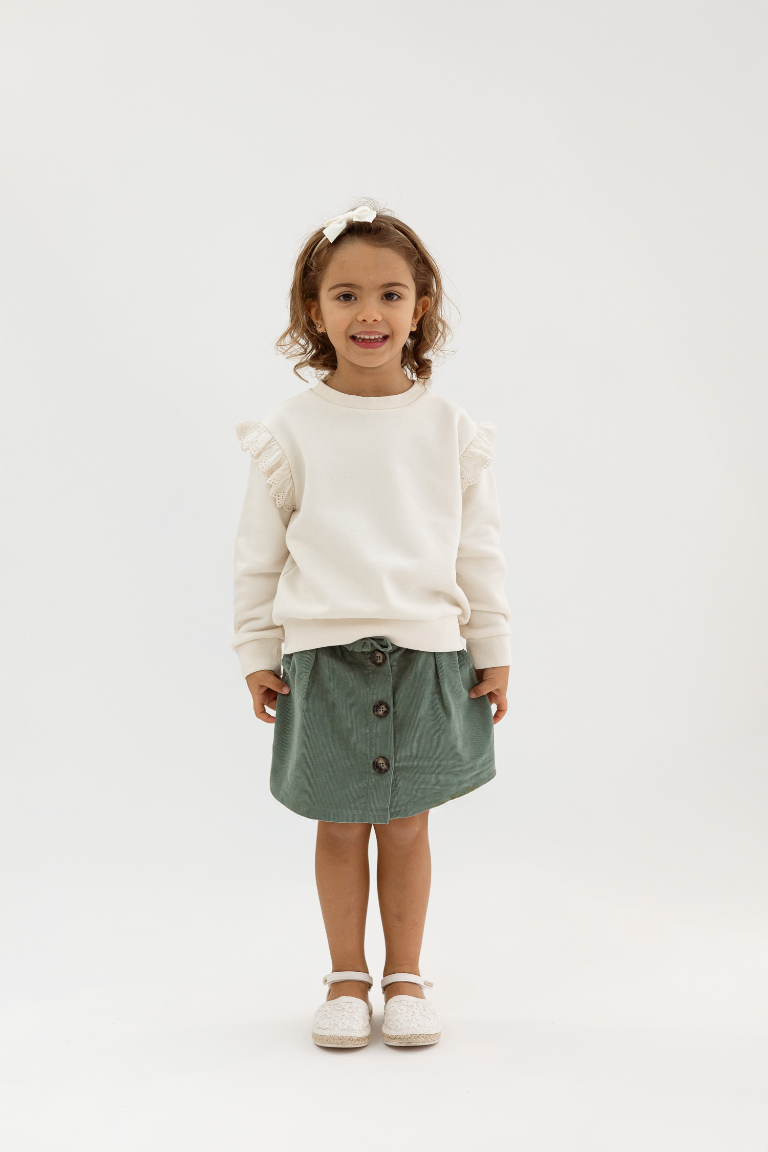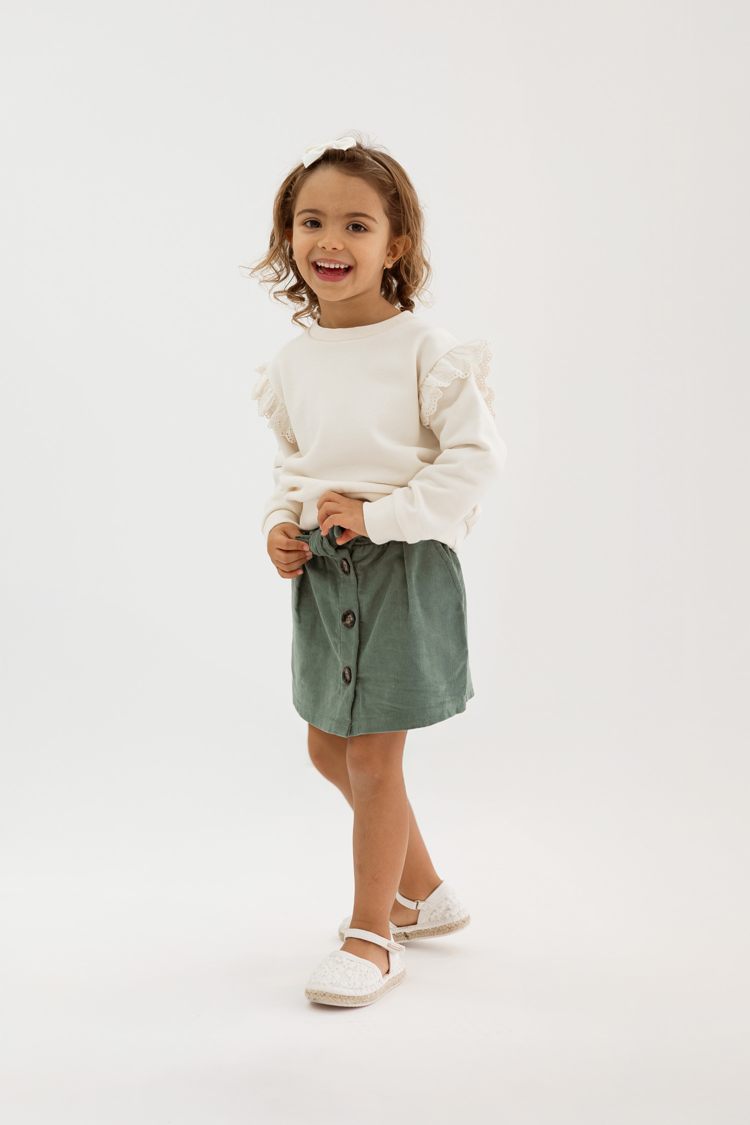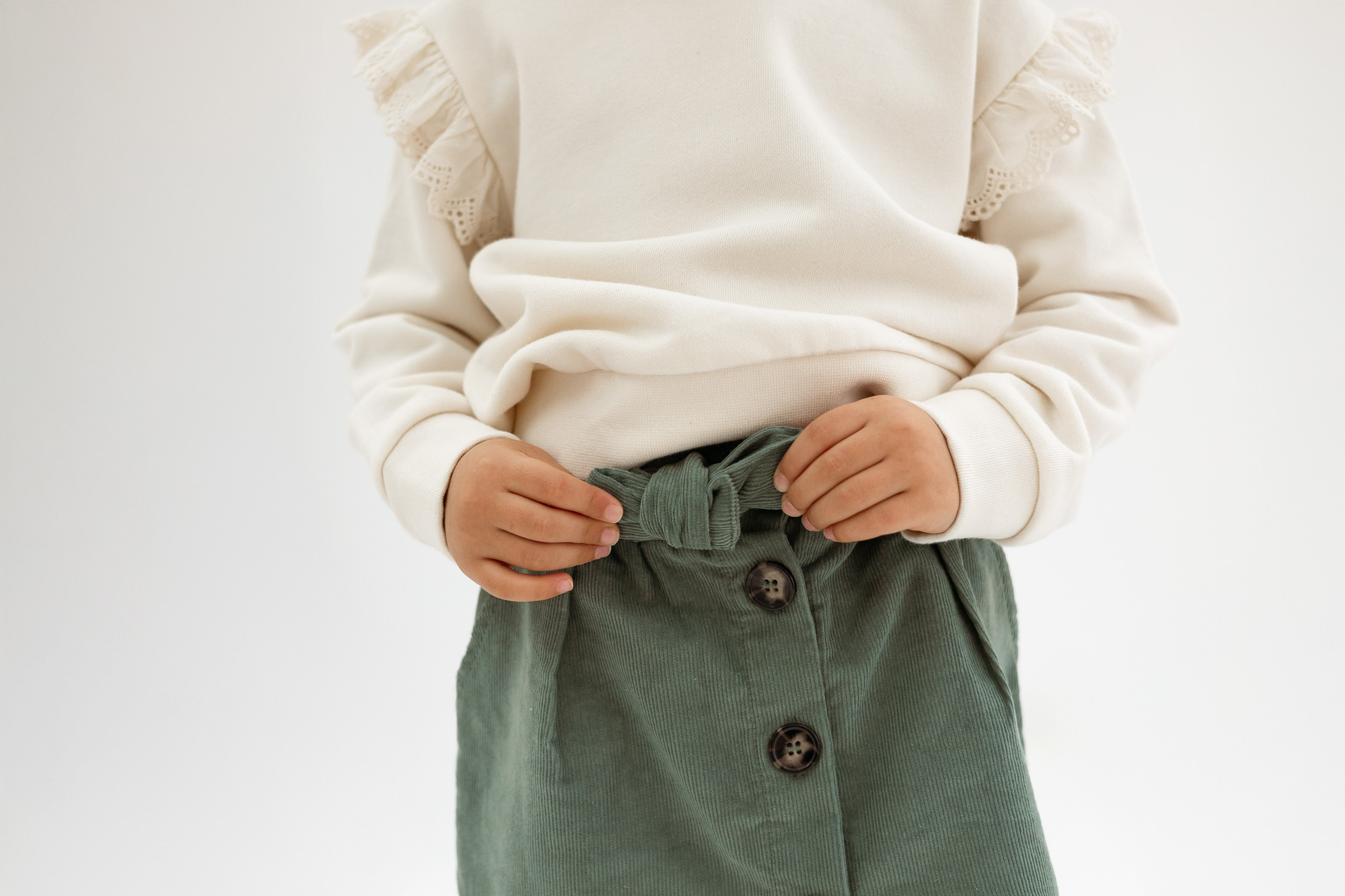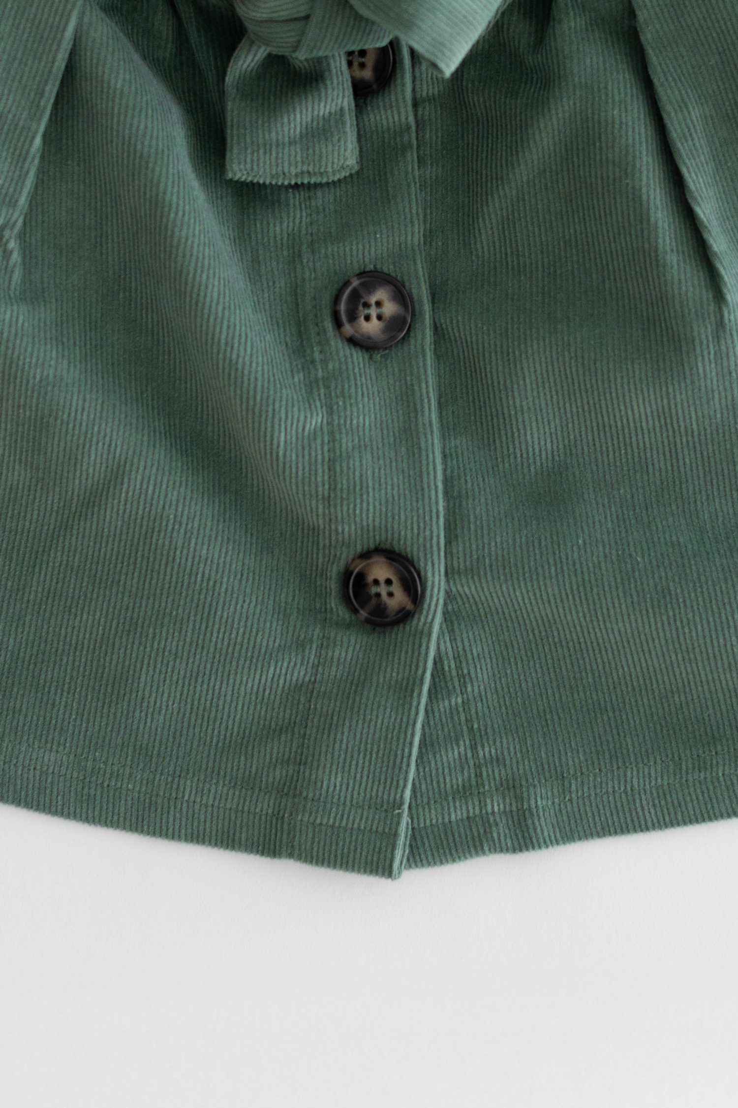 Saia em bombazina outono/inverno de menina, com botões e cinto, cor verde myrtel, produzido em Portugal, 100‰ algodão